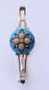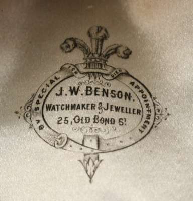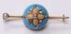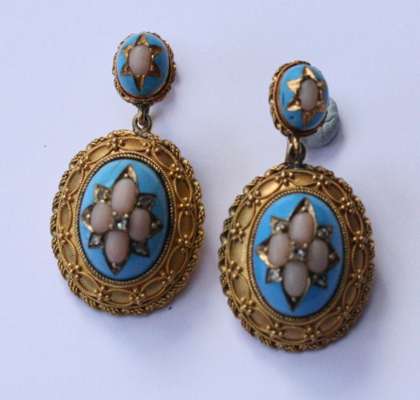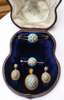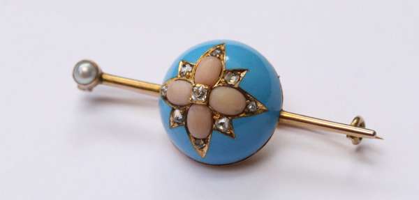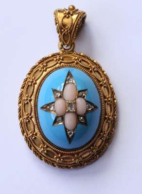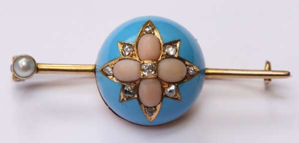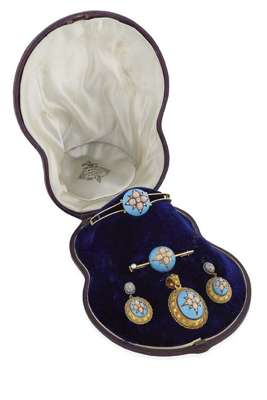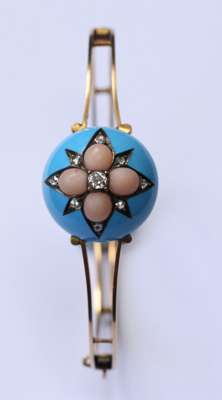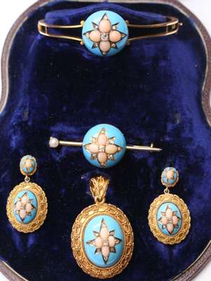 comprising a bangle, bar brooch, pendant and a pair of pendant earrings, each decorated with an old mine cut diamond and coral cabochon set star, to a sky blue enamelled domed ground, most with cannetille decorated borders, the bar brooch additionally set to one terminal with a half-pearl, the pendant with glazed oval aperture to reverse, contained in a tooled purple leather fitted case, stamped J.W. BENSON...OLD BOND STREET