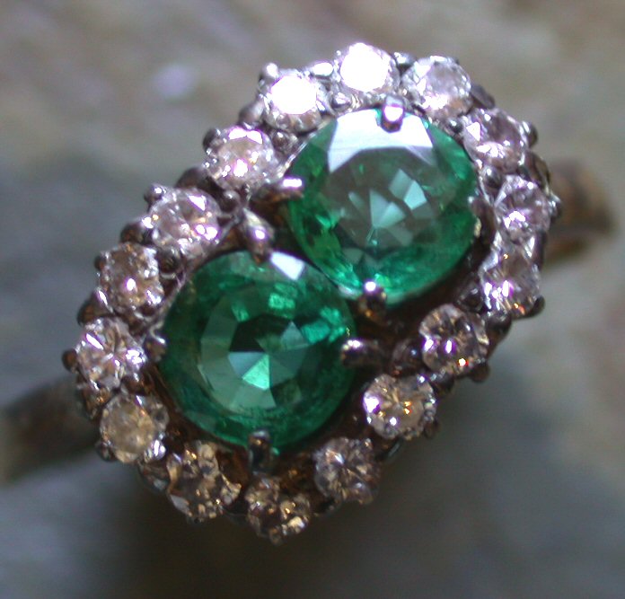 the two circular cut emeralds offset and delicate border of circular cut diamonds
