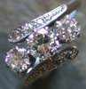 the three stones offset and with a border above and below set circular cut diamonds in platinum