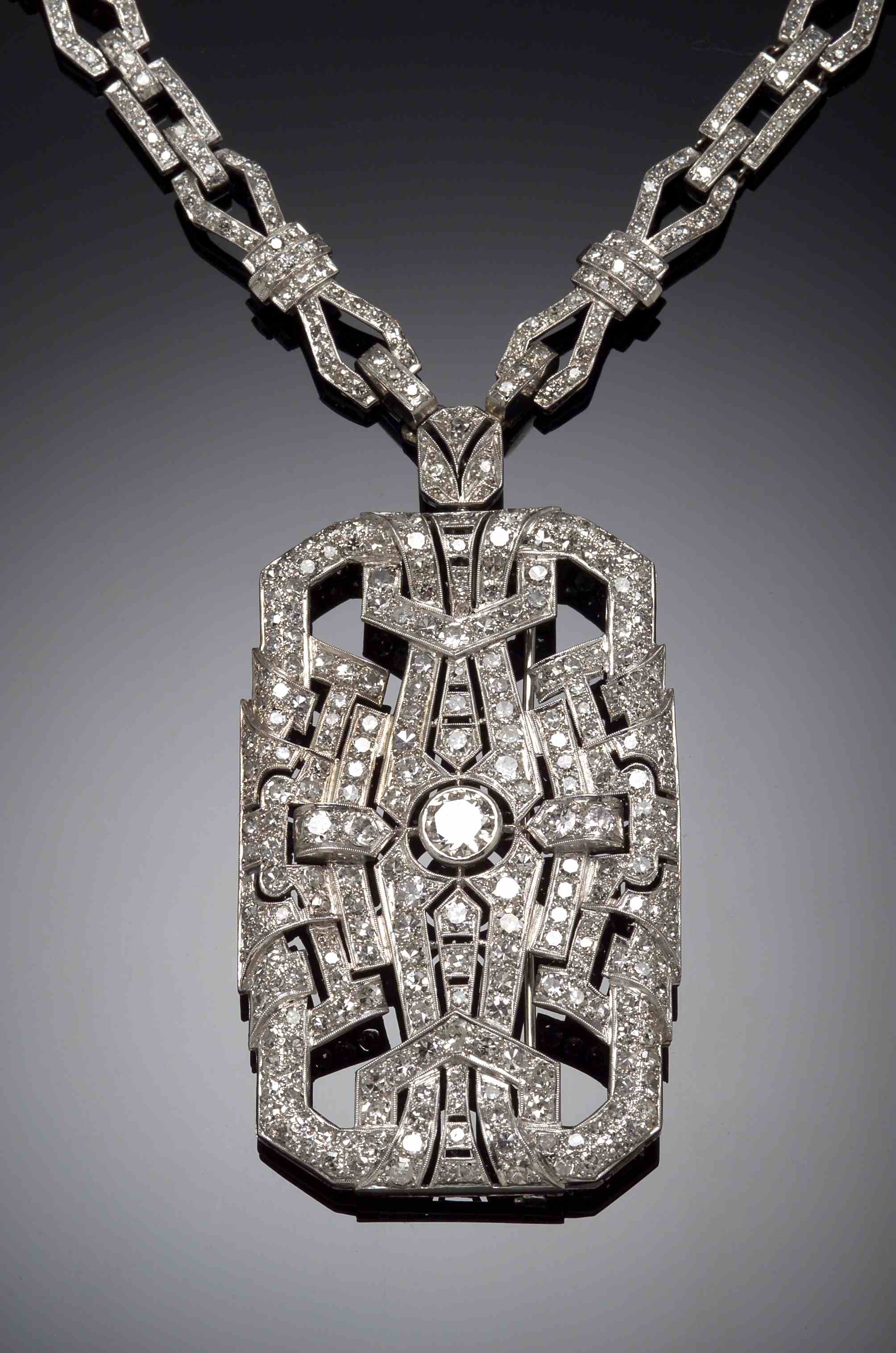 This wonderful sautoir, which splits to form four separate diamond bracelets and a plaque brooch, is so evocative of the Art Deco period and is a good illustration of the geometric motifs found not only in the Jewellery of that time, but in house furnishings, art works, architecture and clothing.