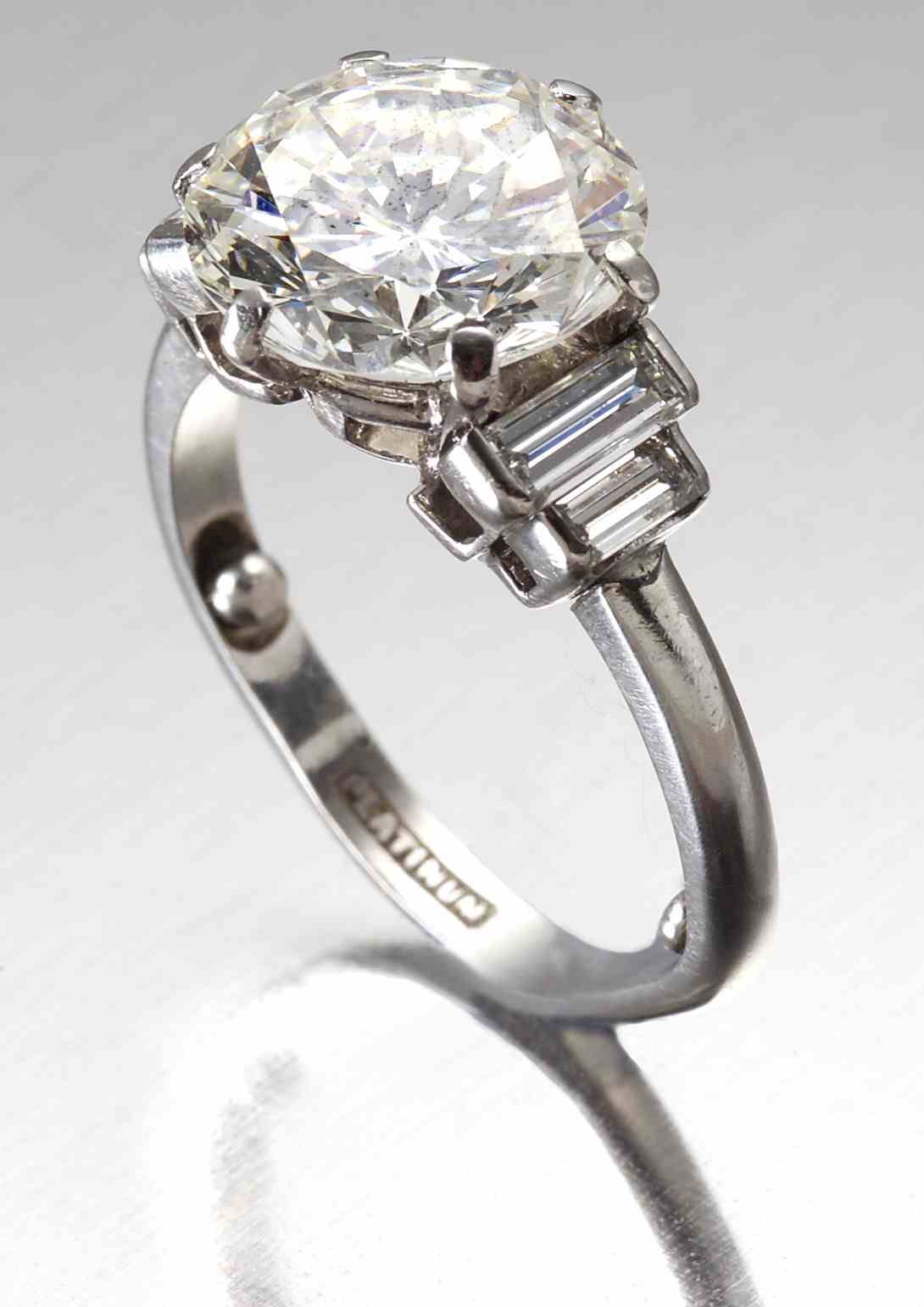 the certificated brilliant cut diamond of 4.6 carats, K - tinted white, VS1, with two graduated baguette diamonds to each shoulder