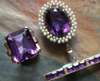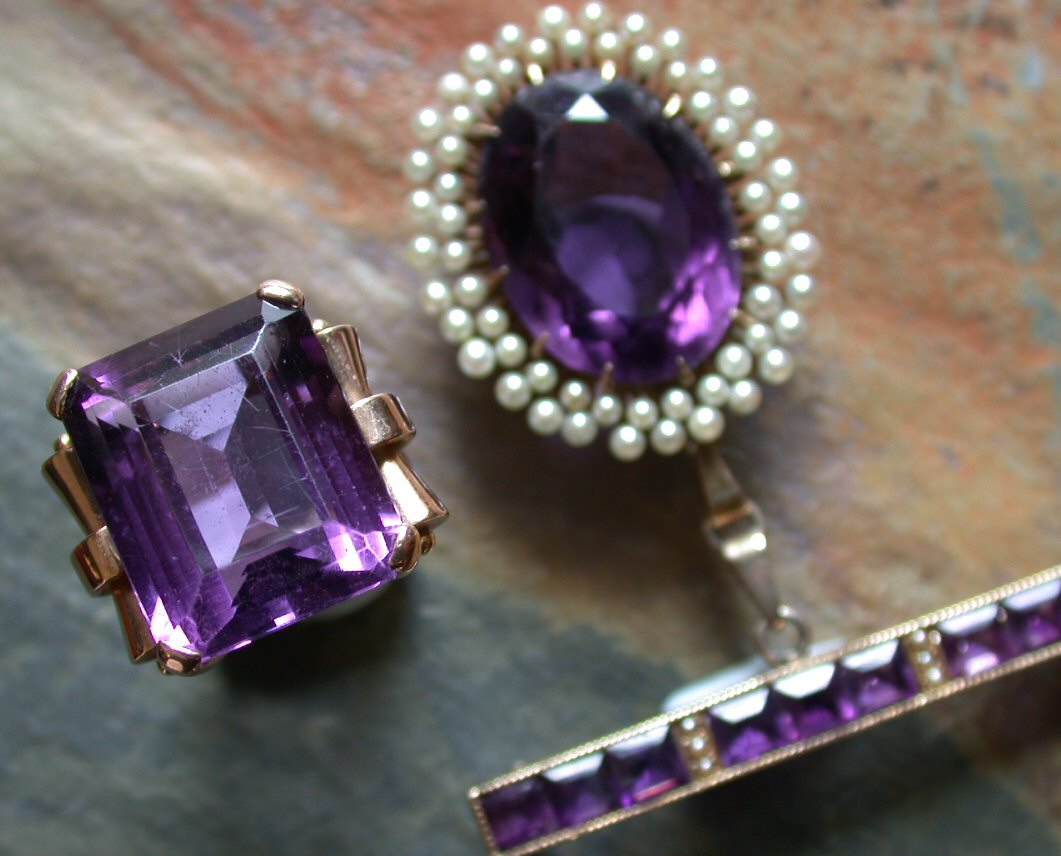 together with a large amethyst pendant brooch with a border of seed pearls suspended from an amethyst bar brooch