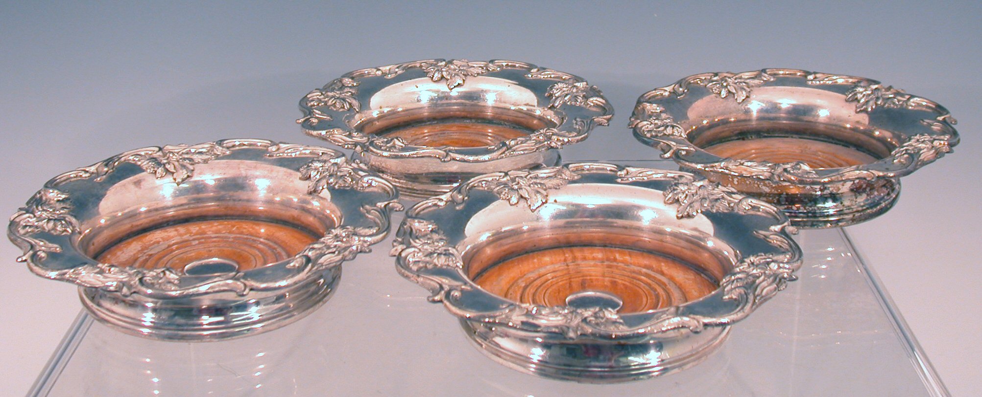 of serpentine circular form, applied c-scroll and floral border, turned wood base with boss