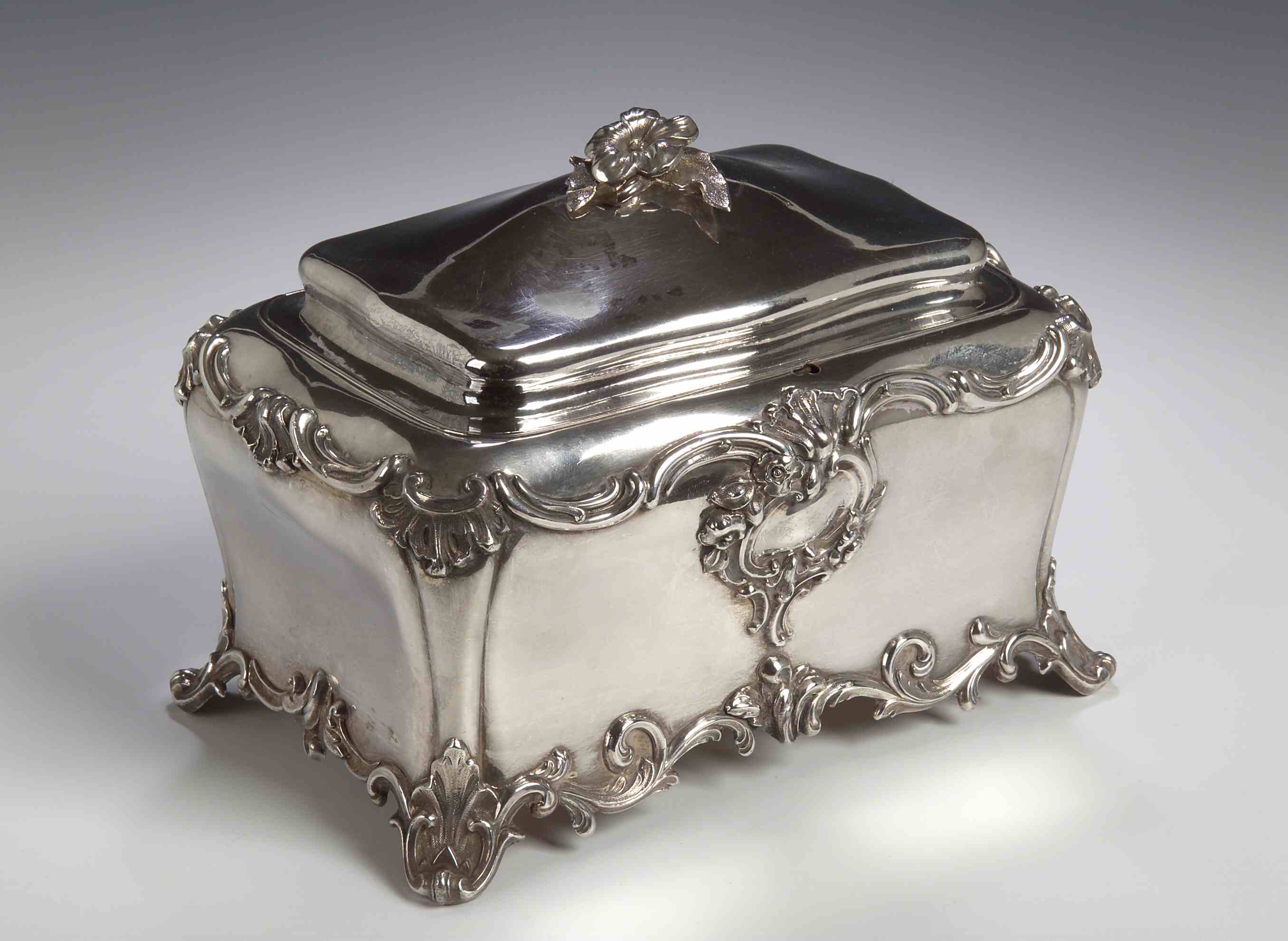 of bombe form and serpentine body decorated c-scrolls and scroll feet, divided interior, the lid with floral finial and lock