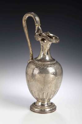 with marks for London 1840, makers probably Rawlins and Sumner, of classical ewer shape, horn scroll handle, the body engraved classical figures in loose clothes, pedestal foot