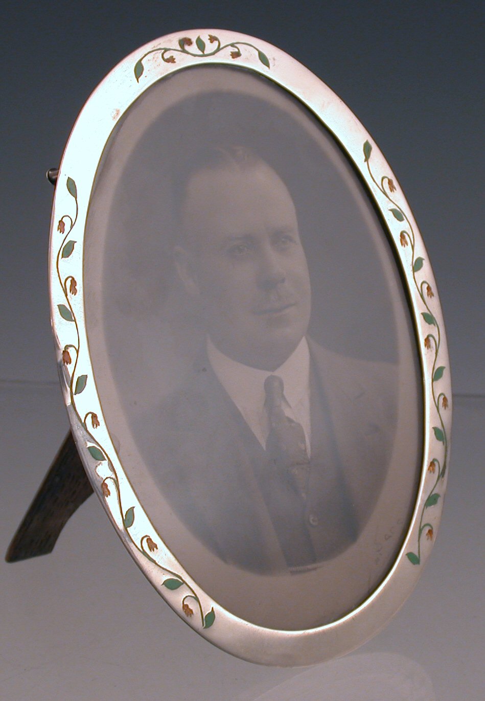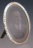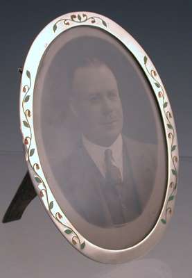 An oval silver and enamel photoframe,