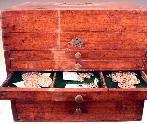 Button Interest: A mahogany collectors box with lift up top with five graduated drawers,