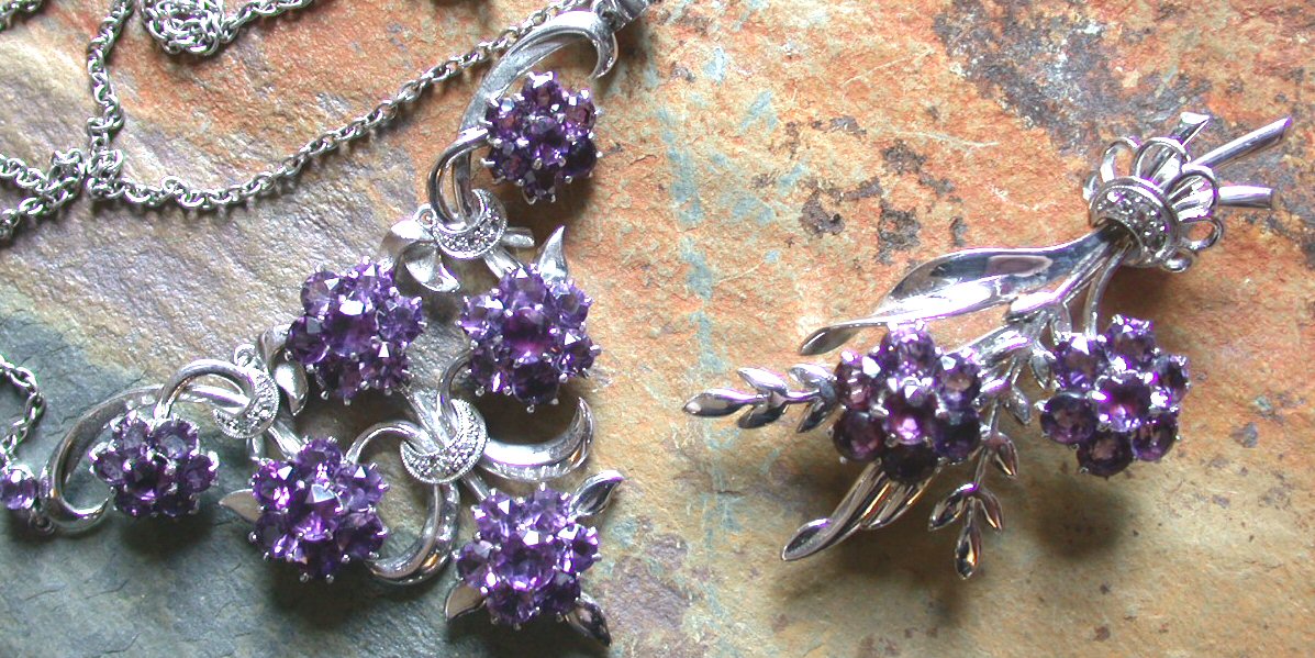 the six floral clusters with diamond set scrolls joining each cluster, fine link chain together with a spray brooch to match