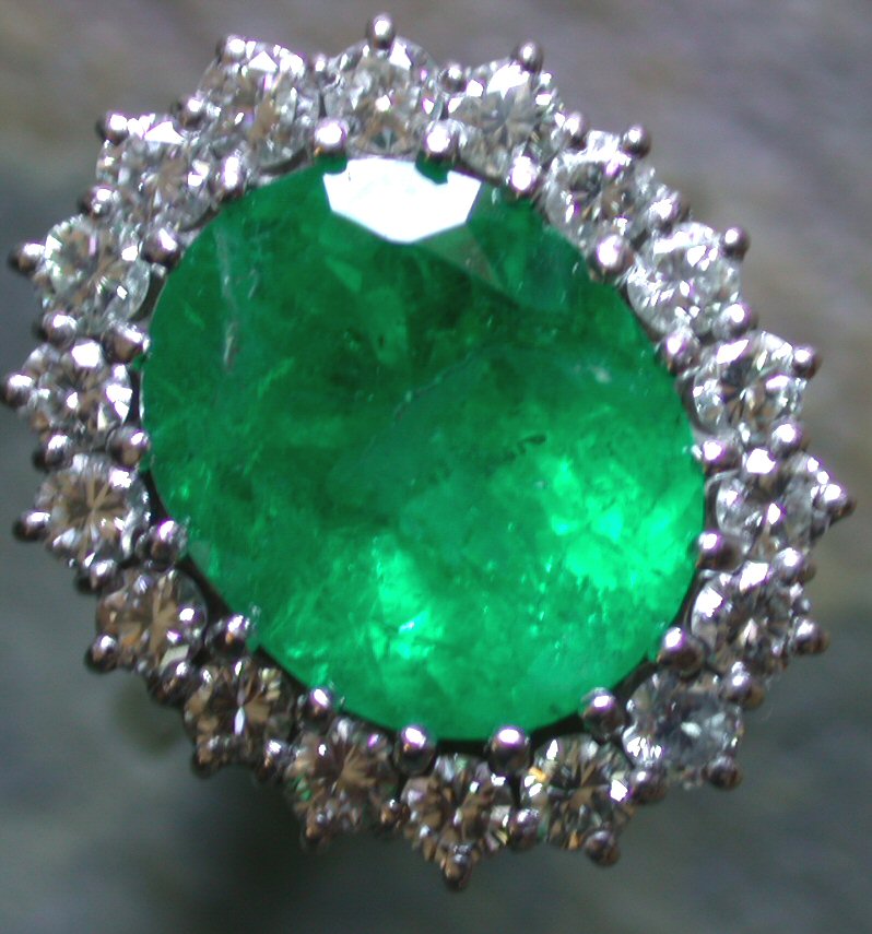 the emerald of good colour and weighing approximately 15carats, with a claw set border of circular cut diamonds, the shank with sprung section