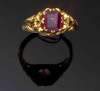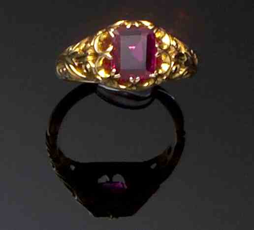 the square step cut ruby claw set in a decorated mount in yellow gold
