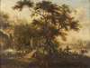 A WOODED RIVER LANDSCAPE WITH FIGURES AND HILLTOP VILLAGE