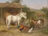 PONIES, GOAT AND CHICKENS IN A FARMYARD