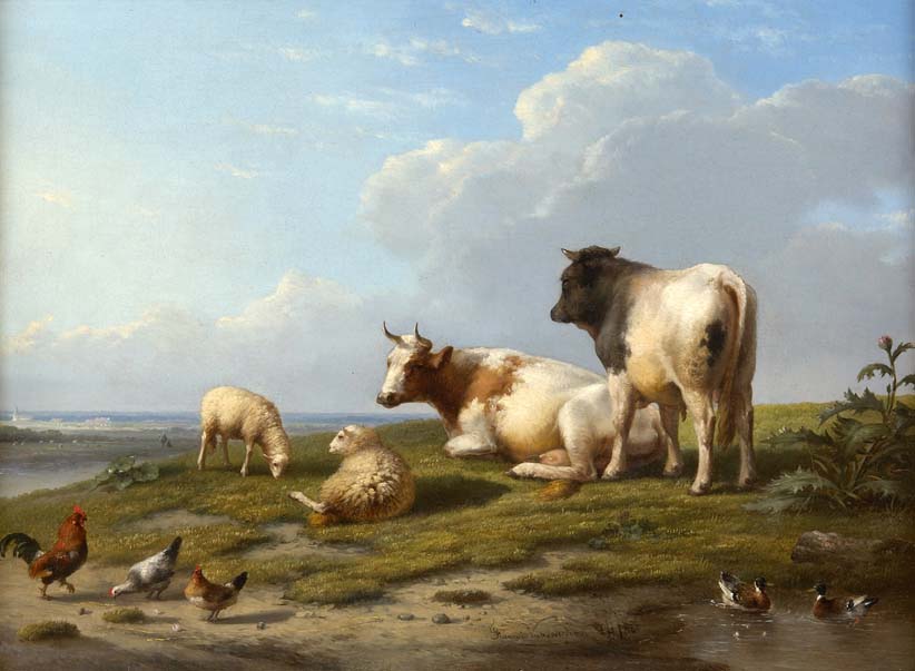 CATTLE, SHEEP AND HENS IN A LANDSCAPE