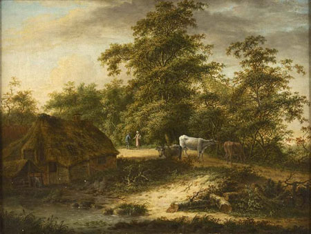 A WOODED RIVER LANDSCAPE WITH GRAZING CATTLE