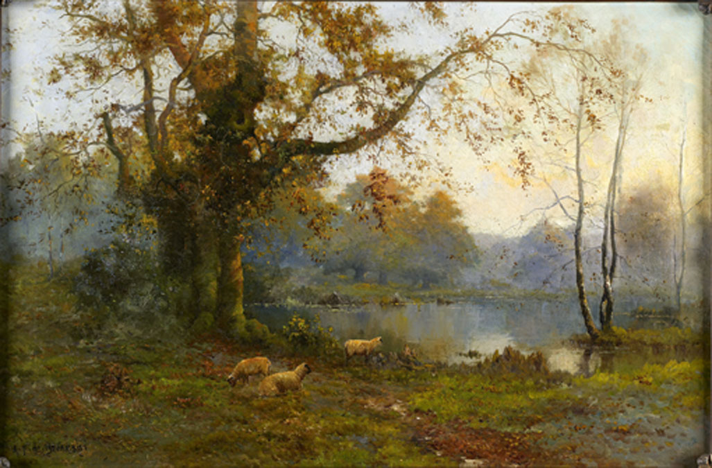SHEEP GRAZING BY A LAKE, AUTUMN