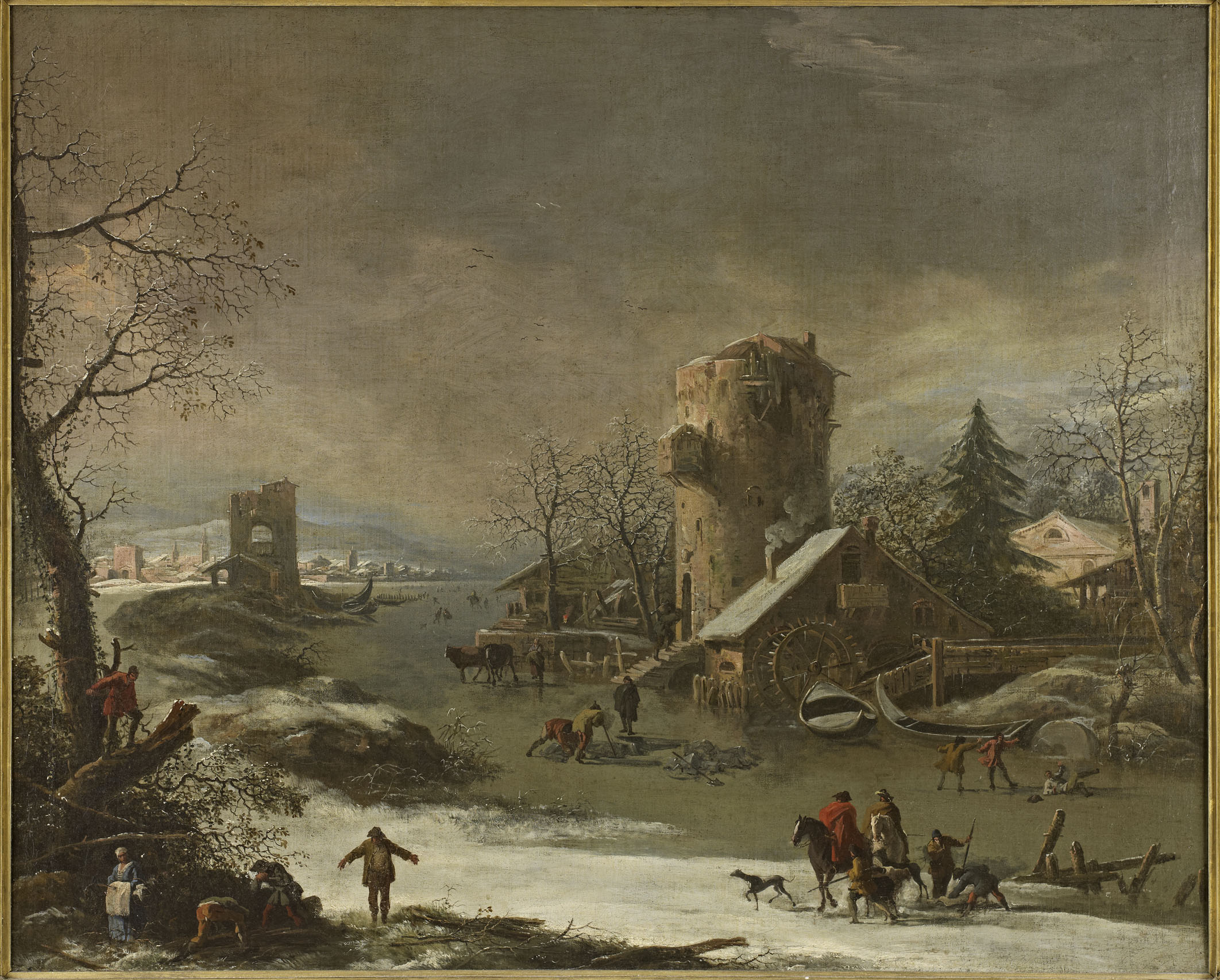 A SNOW COVERED RIVER LANDSCAPE WITH FIGURES AND ANIMALS