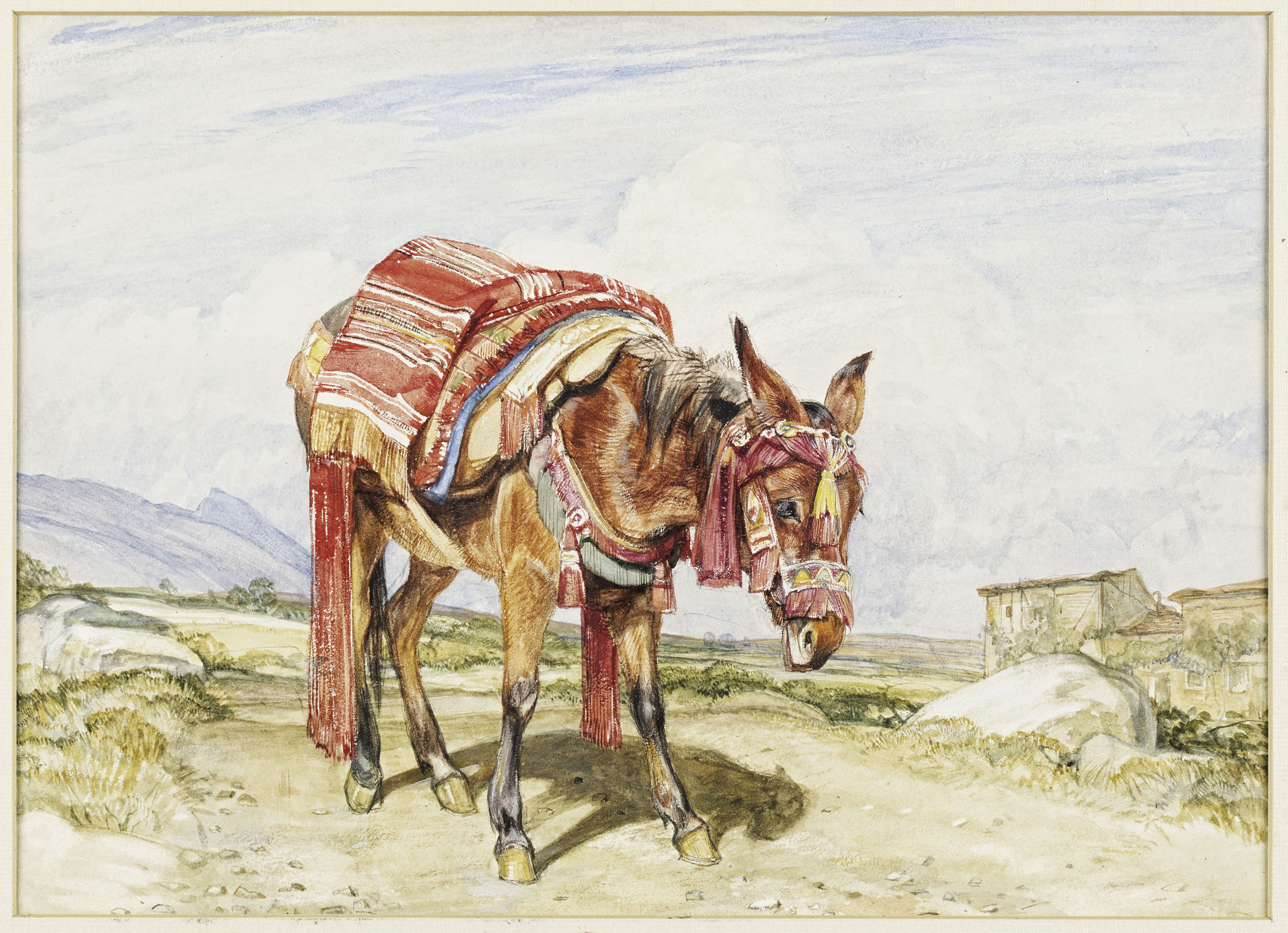Note:The same or similar mule with comparable trappings but differently posed appears in two of the lithographs in Lewis's Spain & Spanish Character, 1836, no.11, Muleteers of the Ronda and no. 18, Gaucin smugglers coming out of Gibraltar. The original watercolour for the latter is in Birmingham Museums and Art Gallery.