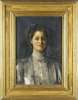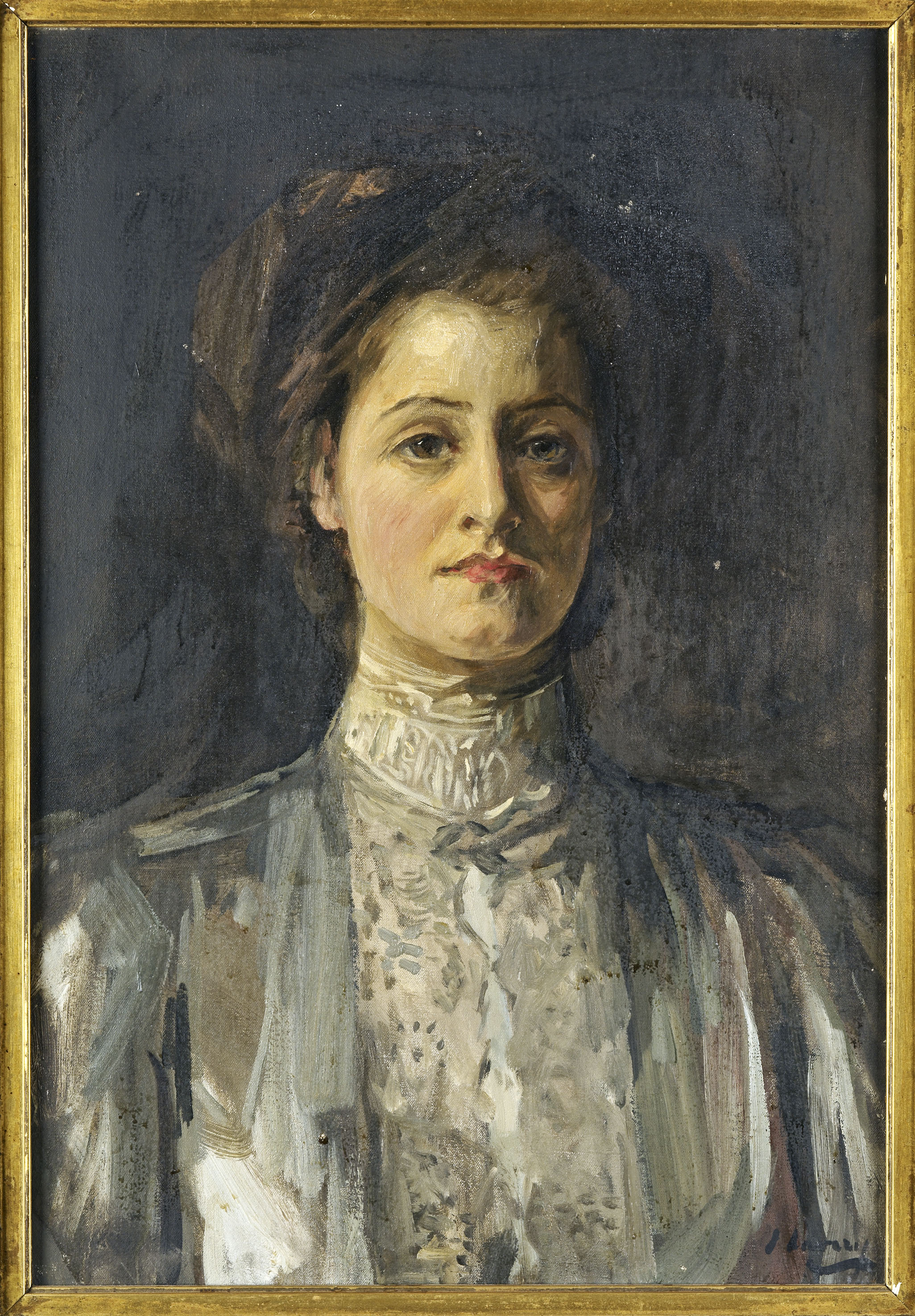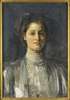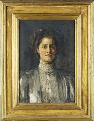 Note:Lavery would often begin a portrait by working on a small scale - experimenting with poses and colour schemes. On occasions he also produced a swift head study to familiarize himself with a sitter's features. Long experience had taught him to act quickly if he wished to capture the essence of a personality. In an age when high aesthetic value was placed upon the fleeting glimpse, he was rubbing shoulders with the likes of Sargent, Blanche and Boldini, the masters of what Sickert dubbed 'wriggle and chiffon' painting. There is however, no coy 'come hither' posturing in the present study of a woman who holds the painter's eye with calm concentration. Delicate modelling of the eyes and mouth is complemented by staccato notation of the sitter's dress and lace collar.