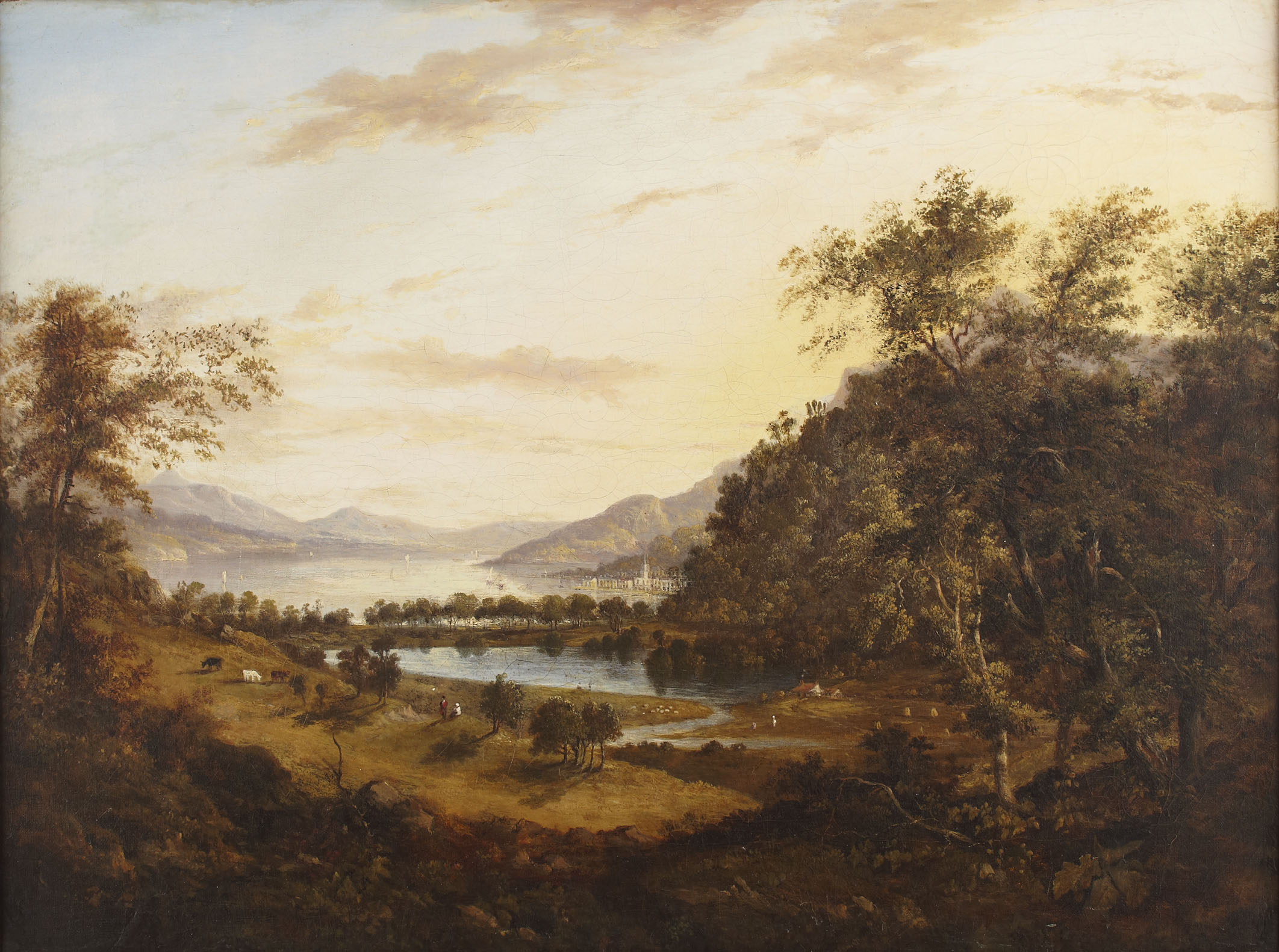A PANORAMIC HIGHLAND LANDSCAPE WITH DISTANT LOCHSIDE TOWN