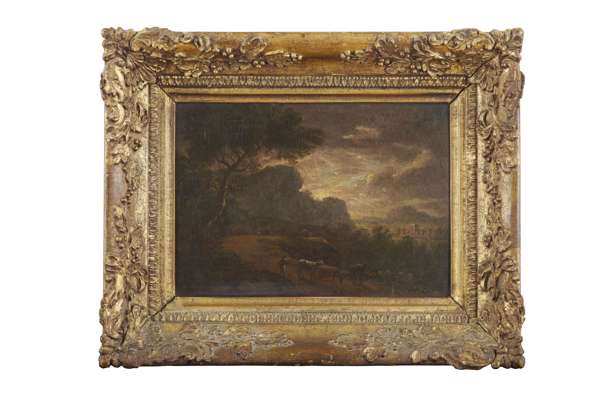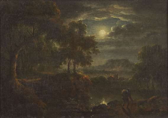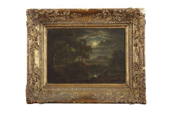 A SHEPHERD AND FLOCK ON A WOODED COUNTRY PATH BY MOONLIGHT