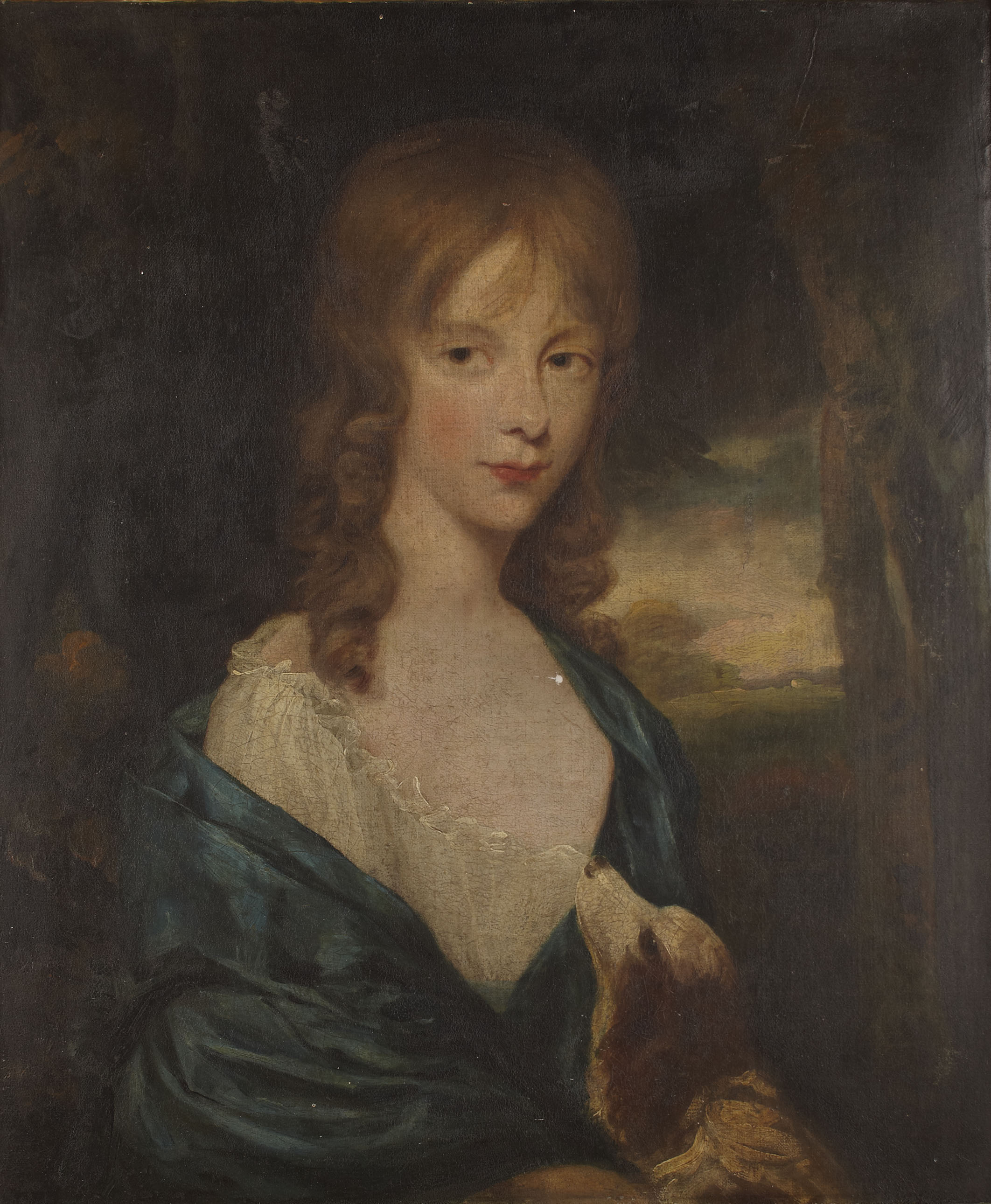 HALF LENGTH PORTRAIT OF A YOUNG GIRL WITH PET DOG