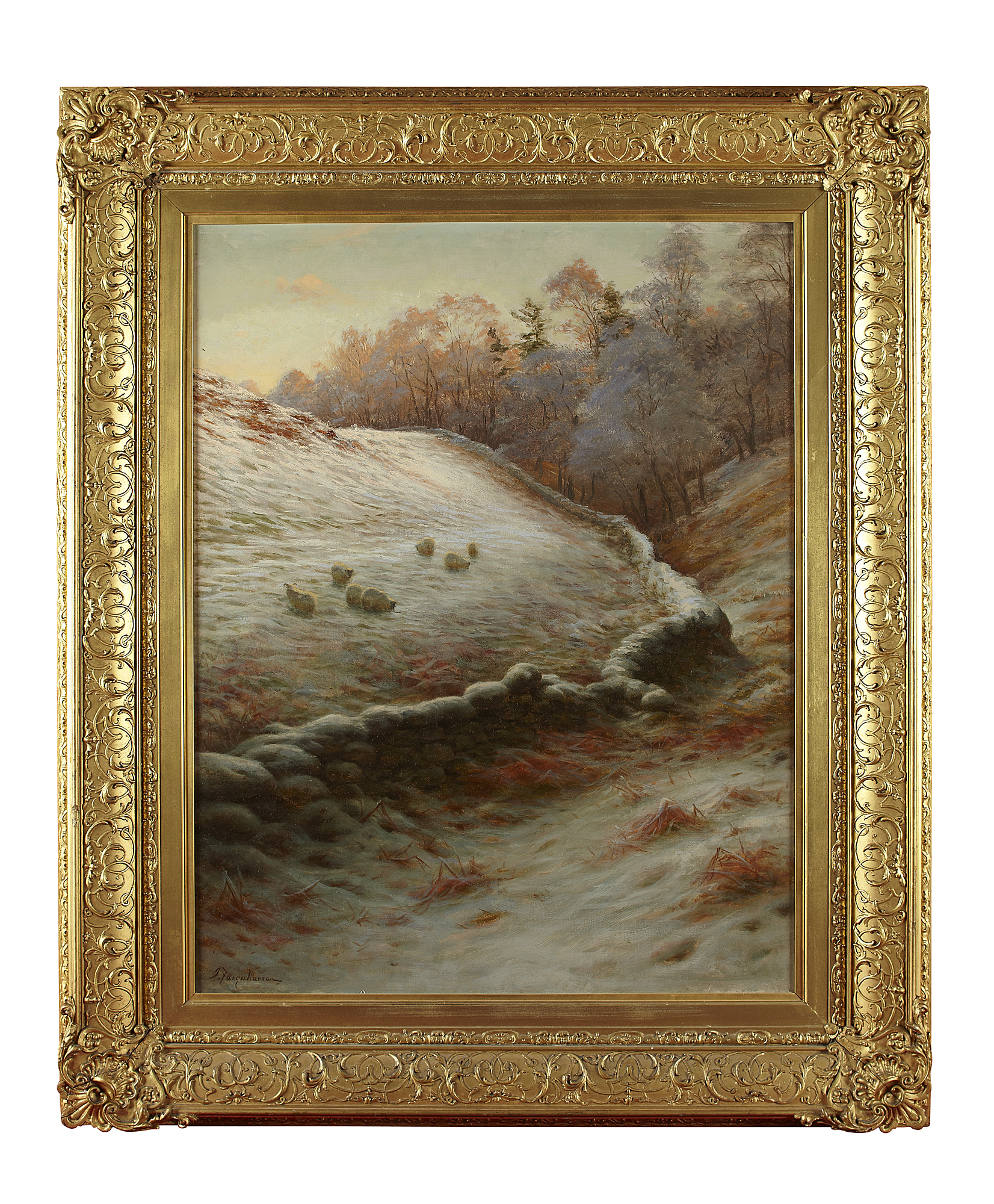 Farquharson became famed for his snow-scenes (leading to the epithet 'frozen-mutton Farquharson'), exhibiting at least one each year in the Royal Academy from 1894 to 1925, excepting 1914, the year of his marriage. This work, exhibited at the Royal Academy in 1911, displays those qualities most-loved in 'The Painting Laird's' work; his faithful capture of the distant rose glow of an evening sun across a winter landscape, the scene filled with a quiet stillness, broken only by the beat of a crow's wing through chill winter air. In this world, nature rules supreme; man's only trace his weary tracks beaten through snow and mingled with those of the sheep he has led on to warmer pastures, the cottages around the stream's bend bowed beneath their frosty blanket, yet hinting at warmth and companionship beside the hearth. Indeed, such works were so admired that crowds would eagerly gather around them at the Royal Academy shows, delighting in each subtle variation on familiar themes, while prints after his paintings proved infinitely popular.