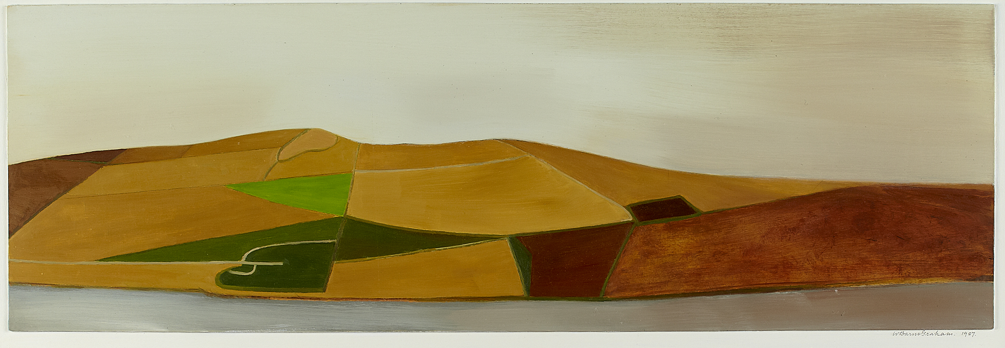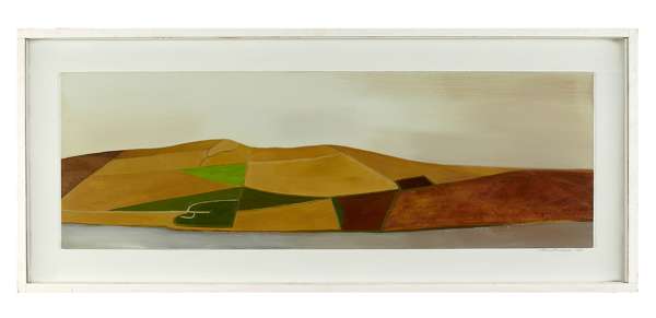 Alongside her more abstract work, Wilhelmina found constant inspiration in landscape, such as the golden patchwork tints of rolling Scottish hills in her work of 1987, September in Orkney. Barns-Graham visited Orkney several times throughout the 1980’s, and indeed on an earlier trip she had delighted in the natural geological slab patterns of Warbeth’s beach, recreating them in the fine acrylicWarbeth No. 4, (1985), in which they attain the clarity and deep tone of stained glass. Quite different in atmosphere is the bright gouache of 1986, Summer Painting Series (No. 4). While illustrating the artist’s continuing attraction to strong geometric forms, in this vibrant and playful depiction of a sun-drenched afternoon on St Ives’ Porthmeor Beach we see Barns-Graham returning to the figurative style of her early work.