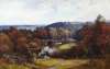A WOODED RIVER LANDSCAPE WITH DISTANT STONE BRIDGE
