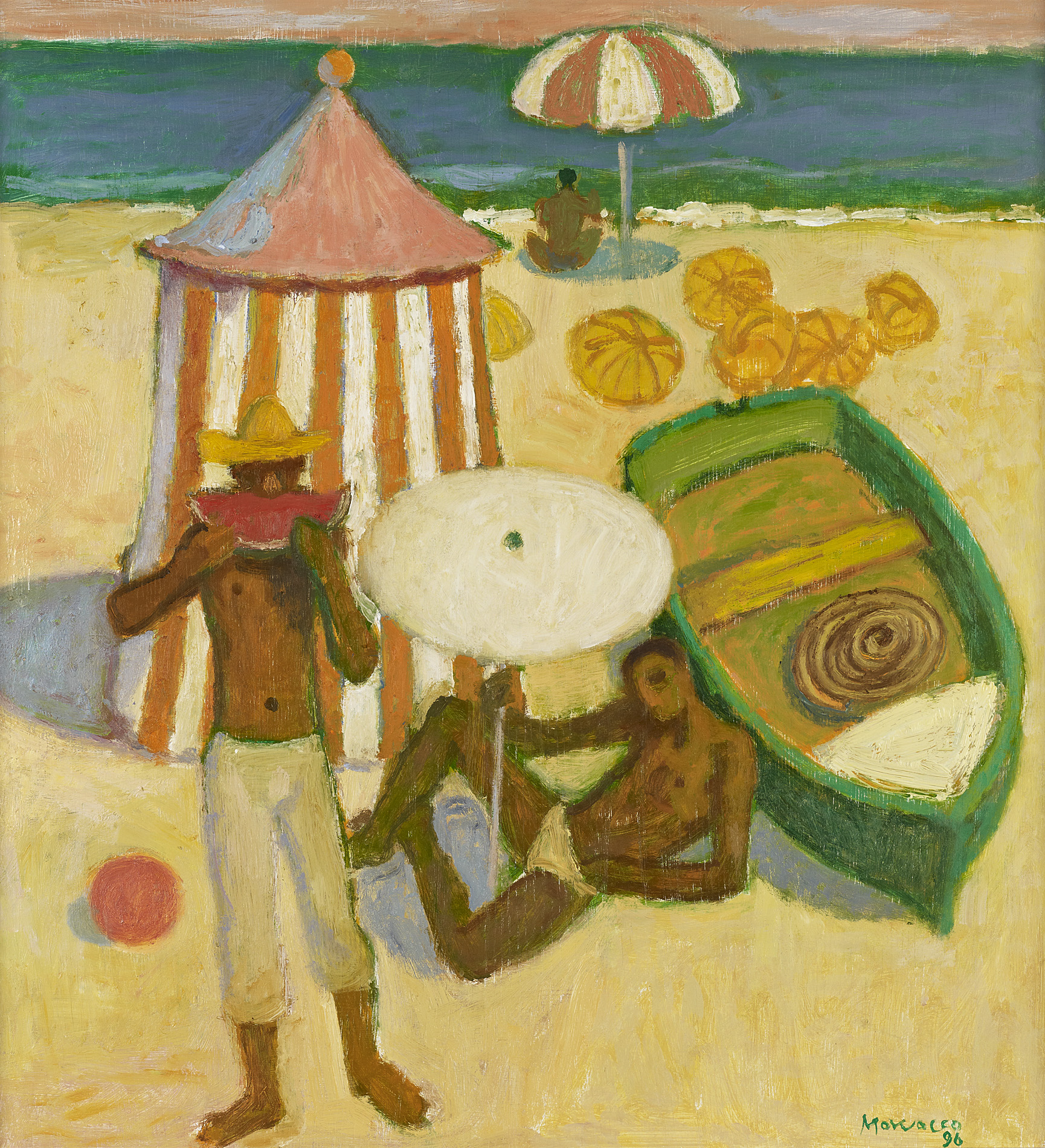 BATHERS WITH GREEN BOAT AND STRIPED TENT
