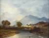 A HIGHLAND RIVER LANDSCAPE WITH DISTANT TOWER