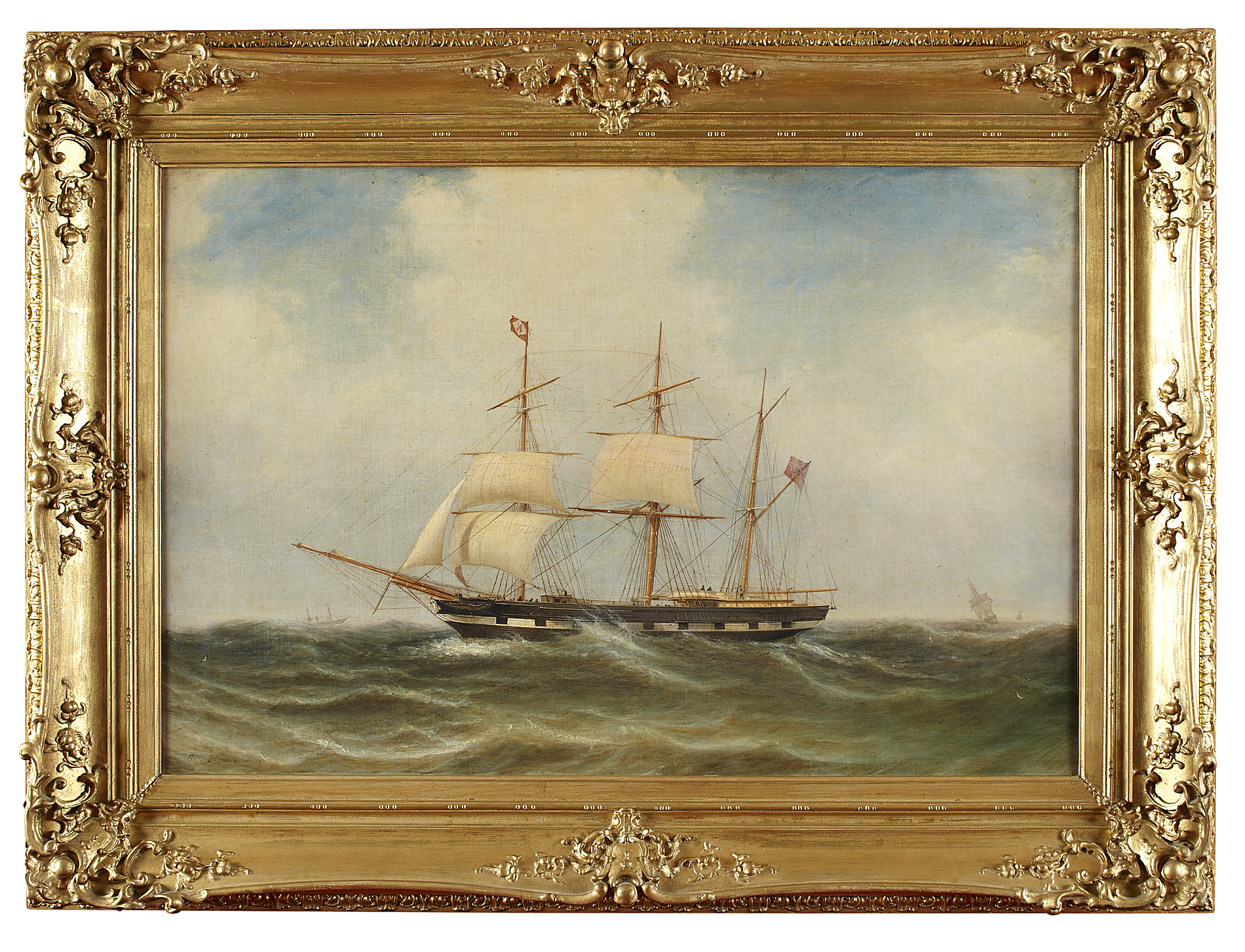 Note: This painting is believed to depict the vessel 'Isabella' that was built in 1852, weighing 392 tons. It is recorded that the ship was sunk in 1860 en route from the Clyde to the West Indies.