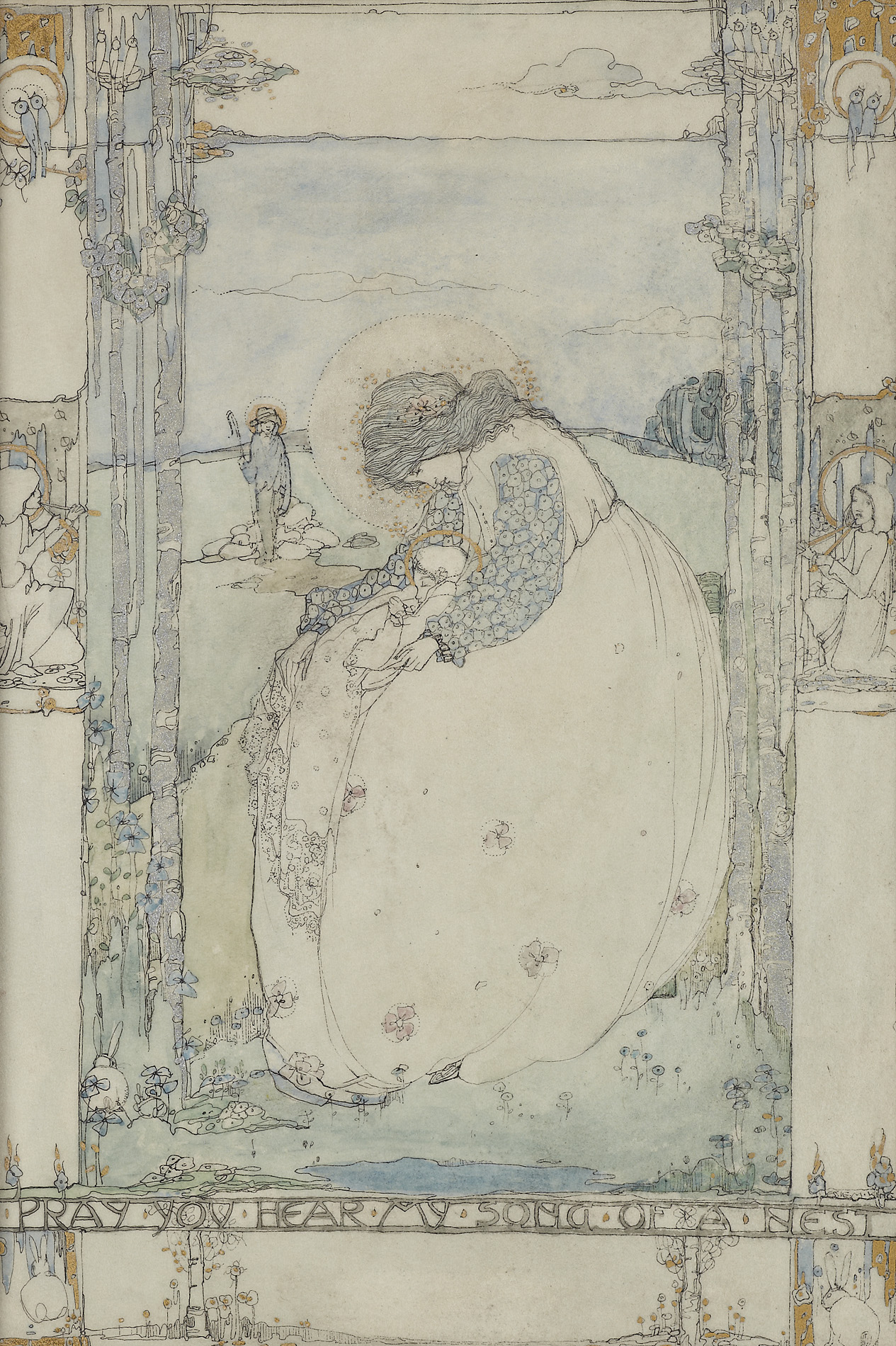 Signed and inscribed, pen and ink and watercolour, heightened with gold and silver