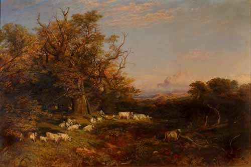 Note:During the early 1850's Sam Bough frequently painted in Cadzow Forest, the property of the Duke of Hamilton. Bough lived in Bothwell Street on the outskirts of Hamilton leaving to work all day until the gloaming had set in. Bough was often accompanied by fellow artists Alexander Fraser and Thomas Fairburn and duing the summer spent much of the time sketching out of doors. Sidney Gilpin in his biography of Bough states "Some of Bough's best work in oils was done during his Hamilton period and on subsequent visits to the locality.Few men could depict the salient points of the sturdy oak with greater truthfulness and vigour, and in this respect the ancient forest with it's peculiar breed of cattle presented excellent ground-work for study"