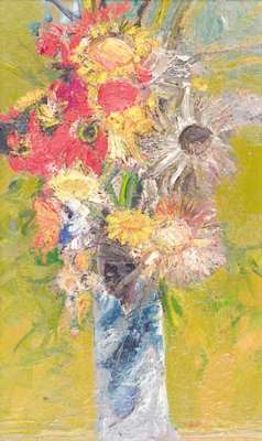 A STILL LIFE OF ASSORTED FLOWERS IN A WICKER BASKET
