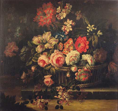 A STILL LIFE OF ASSORTED FLOWERS IN A WICKER BASKET