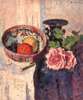 Note:The development of Hunter's painting of still-lives followed anyhing bu a straight line.His early Dutch inspired black background works and the late loosely structured compositiions in which form and paint are handled in a fluid, almost liquid manner serve as identifiable post and antequem. The intervening decade however is not so clear-cut. The strong, bright colours of this still-life and its flattened perpespective suggest a date of c.1923-25. The familiar studio motifs of pink roses lying at the foot of the lug-handled bronze vase and the famille-rose bowl tipped up to reveal and orange and lemon tend to confirm this.