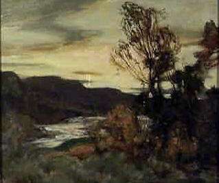 A RIVER LANDSCAPE WITH WATERFALL AT DUSK
