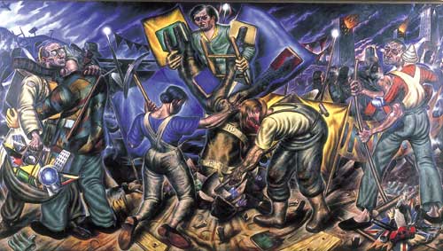 Literature:Julian Spalding in his introduction to the Third Eye Centre exhibition concludes his appraisal of Currie's work to date :" The keenness of observation combined with technical skill is the foundation of Currie's achievement to date. But he pushes beyond this towards a symbolic statement which does not sacrifice the actual in it's aim for the general. This ambition enanbles him to depict not just what the city (Glasgow) looks like from a (safe) distance but what it means to live in as well. In his portrait of a city, people loom largest. At a stroke he has made realist painting suddenly and obviously relevant again."