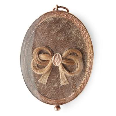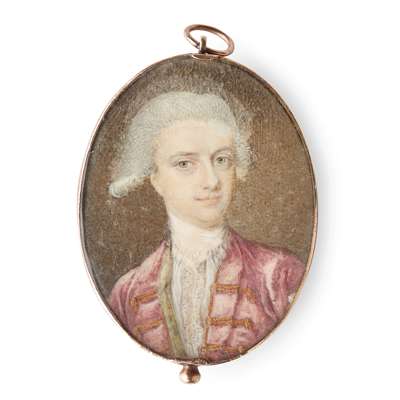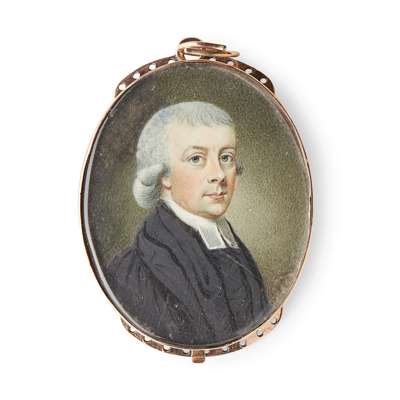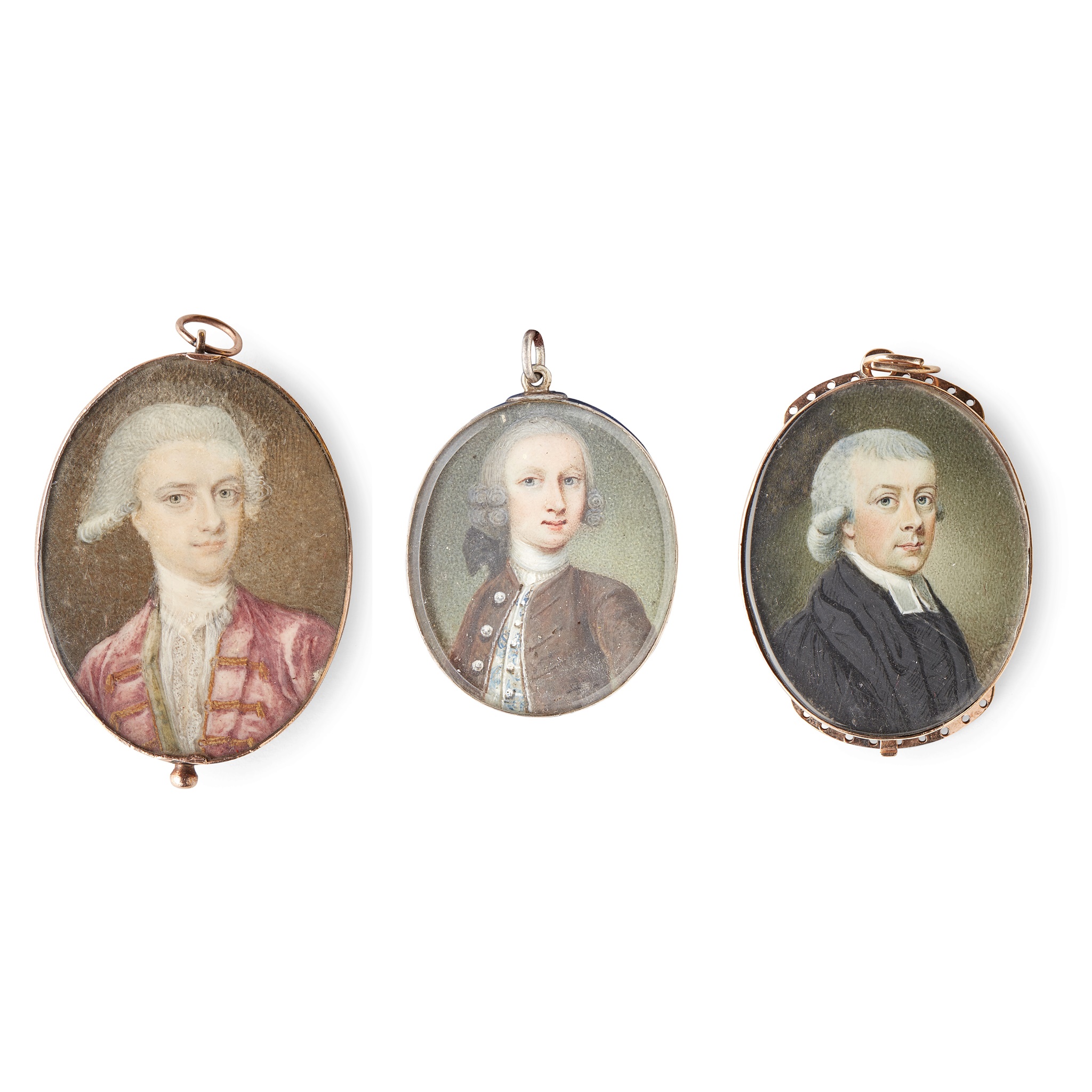 the first in watercolour on ivory, the sitter with white powdered wig, a white cravat and a pink coat with gold details, with plaited hair to reverse; the second in watercolour on ivory, the sitter a clergyman with white powdered hair, white collar and black jacket; the third in watercolour on ivory, the sitter with a powdered wig tied back with a ribbon, white cravat and a brown jacket, with plaited hair to reverse