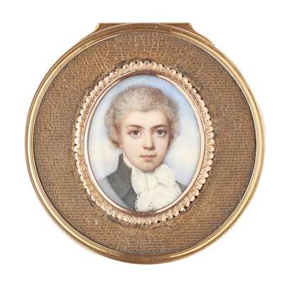 the circular box covered in gold and black striped vellum, with a tortoiseshell interior; the lid mounted with an ivory watercolour portrait miniature of a boy with white powdered hair, wearing a white cravat and black coat in against a cloudy sky