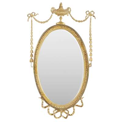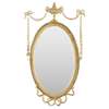 the oval bevelled mirror plate in a leaf tip moulded frame with an urn cresting and ribbon-tied laurel trails
