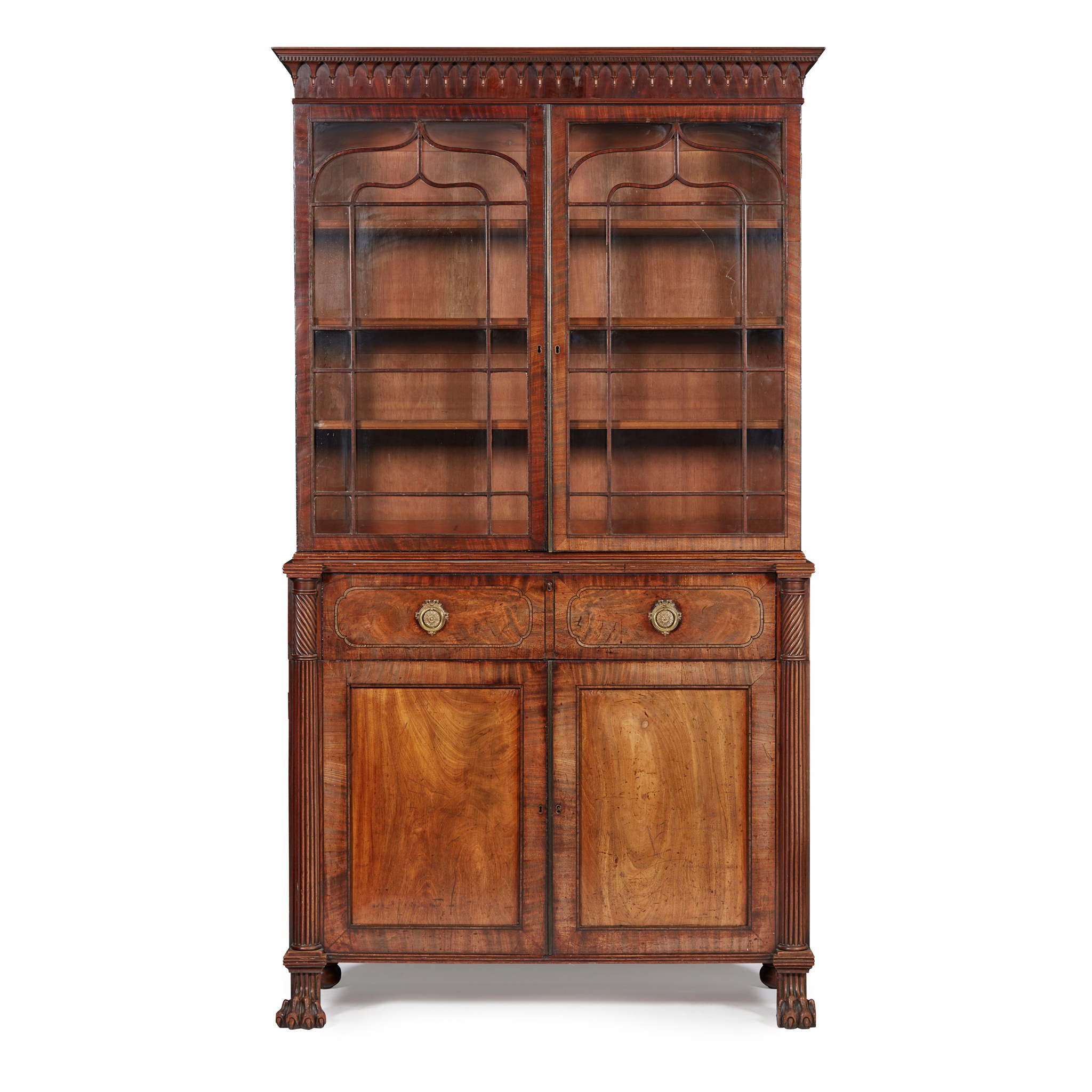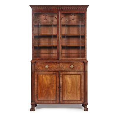 the dentil and lancet moulded cornice above a pair of astragal glazed doors opening to adjustable shelves, the projecting base with a long frieze drawer over a pair of panel doors flanked by reeded columns, opening to shelves and a base drawer, raised on carved paw feet