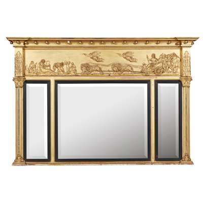 the ball mounted cornice above a gesso moulded frieze depicting Apollo in his chariot drawn by lions, above three bevelled mirror plates within ebonised slips flanked by pilasters