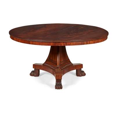 the circular tilt top with a moulded edge and plain frieze, raised on a panelled and tapered triform column outlined with bead moulding, on a triform base with carved paw feet