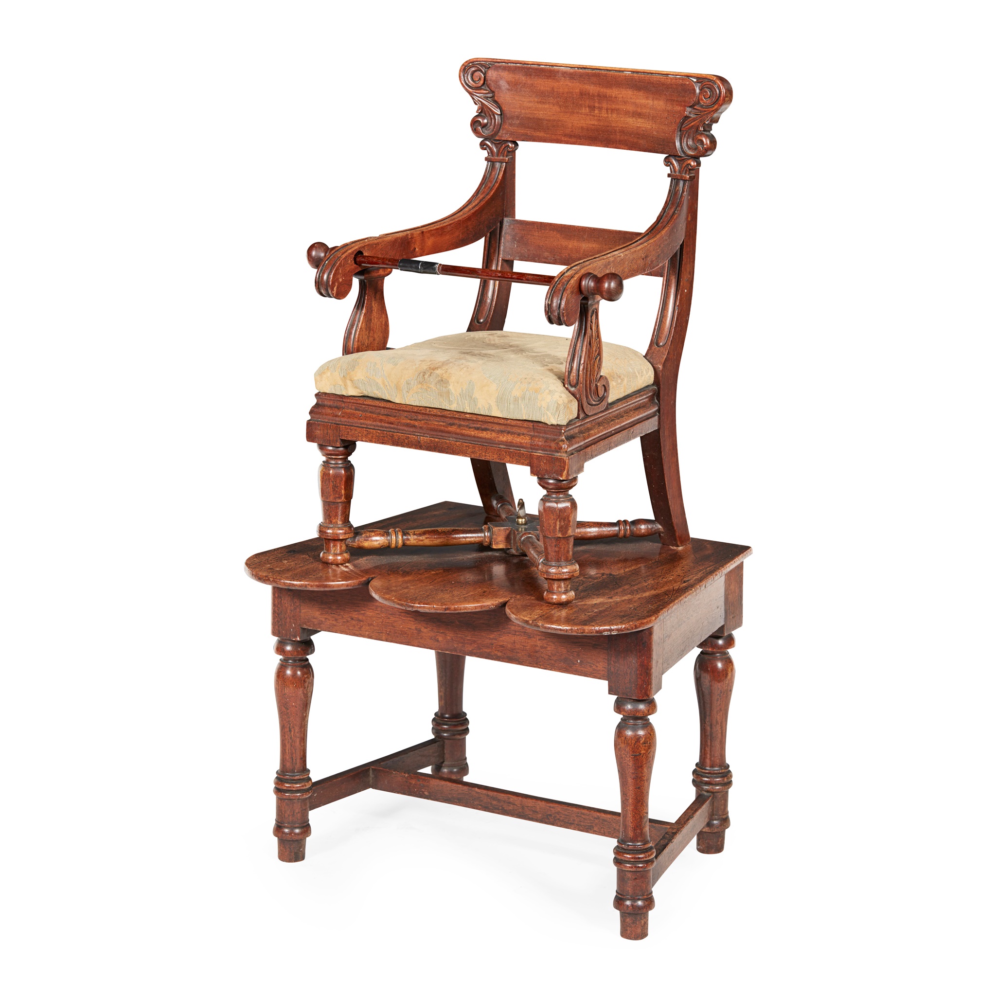 the chair with a tablet back and reeded scrolled arms with a cross-bar, above a loose cushion seat raised on baluster legs joined by X-form stretchers; on a platform base with a lobed front and baluster legs joined by an H-stretcher
