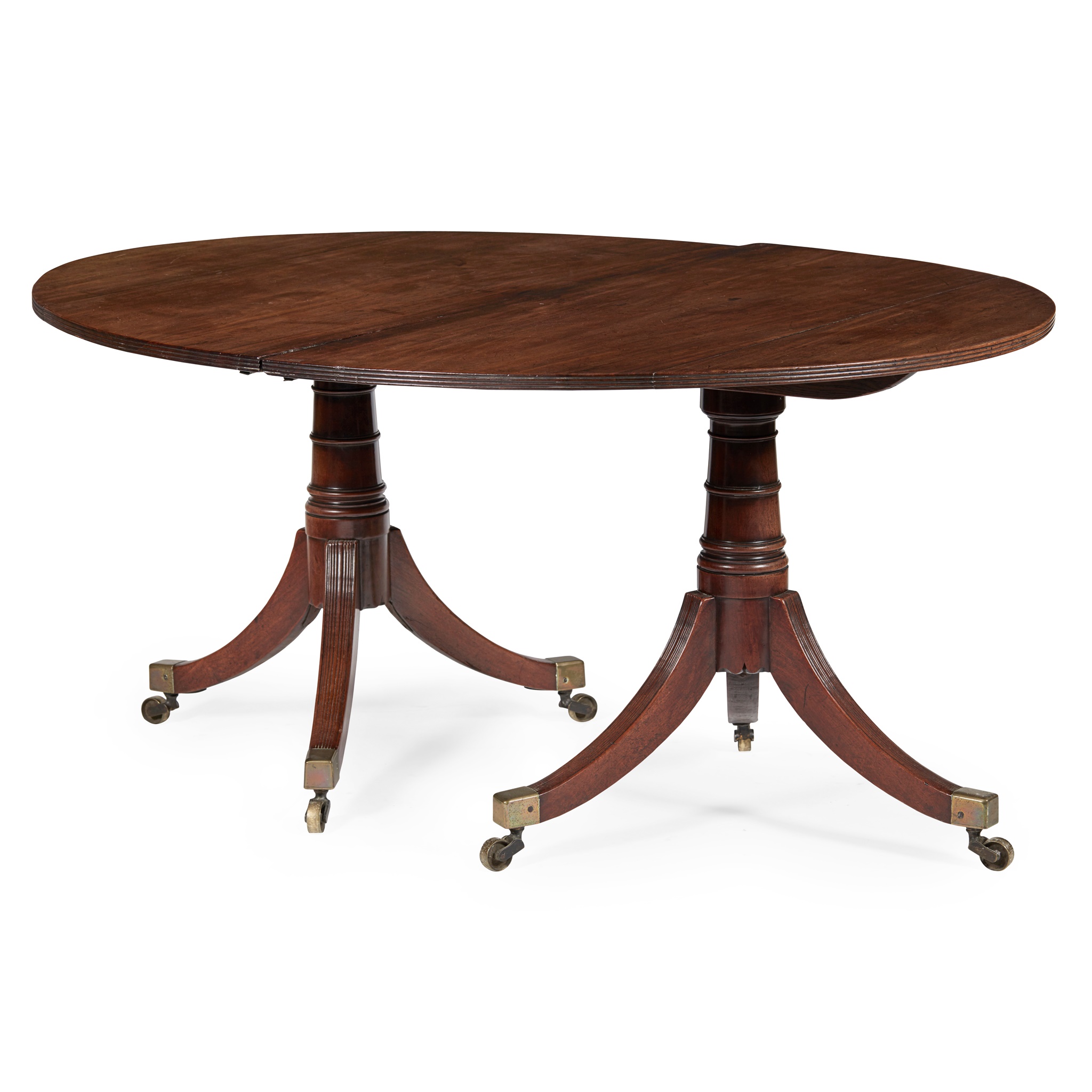 the oval top with a reeded edge, on ring-turned pillars and reeded sabre legs ending in brass caps and castors