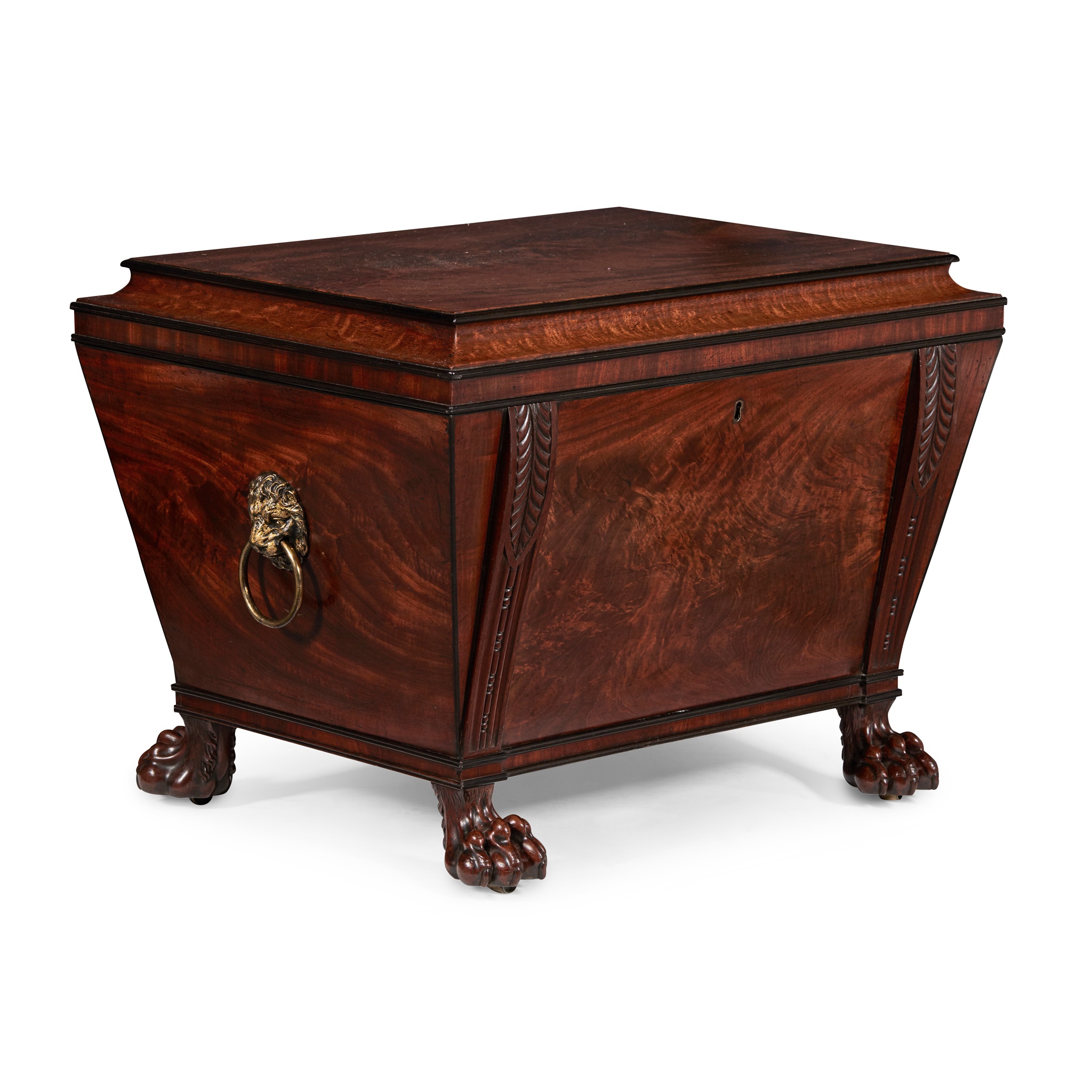 of sarcaphogus form, the hinged cover opening to a lined and compartmented interior, the front and back panels with carved palmette mouldings, with brass lions' mask handles to the sides, raised on carved paw feet with recessed brass castors