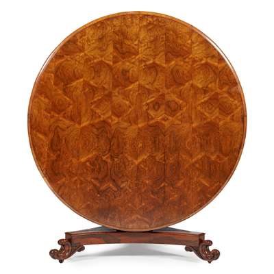 the sectional veneered tilt top above a turned and lobed carved pedestal on a triform base raised on scroll feet with brass castors