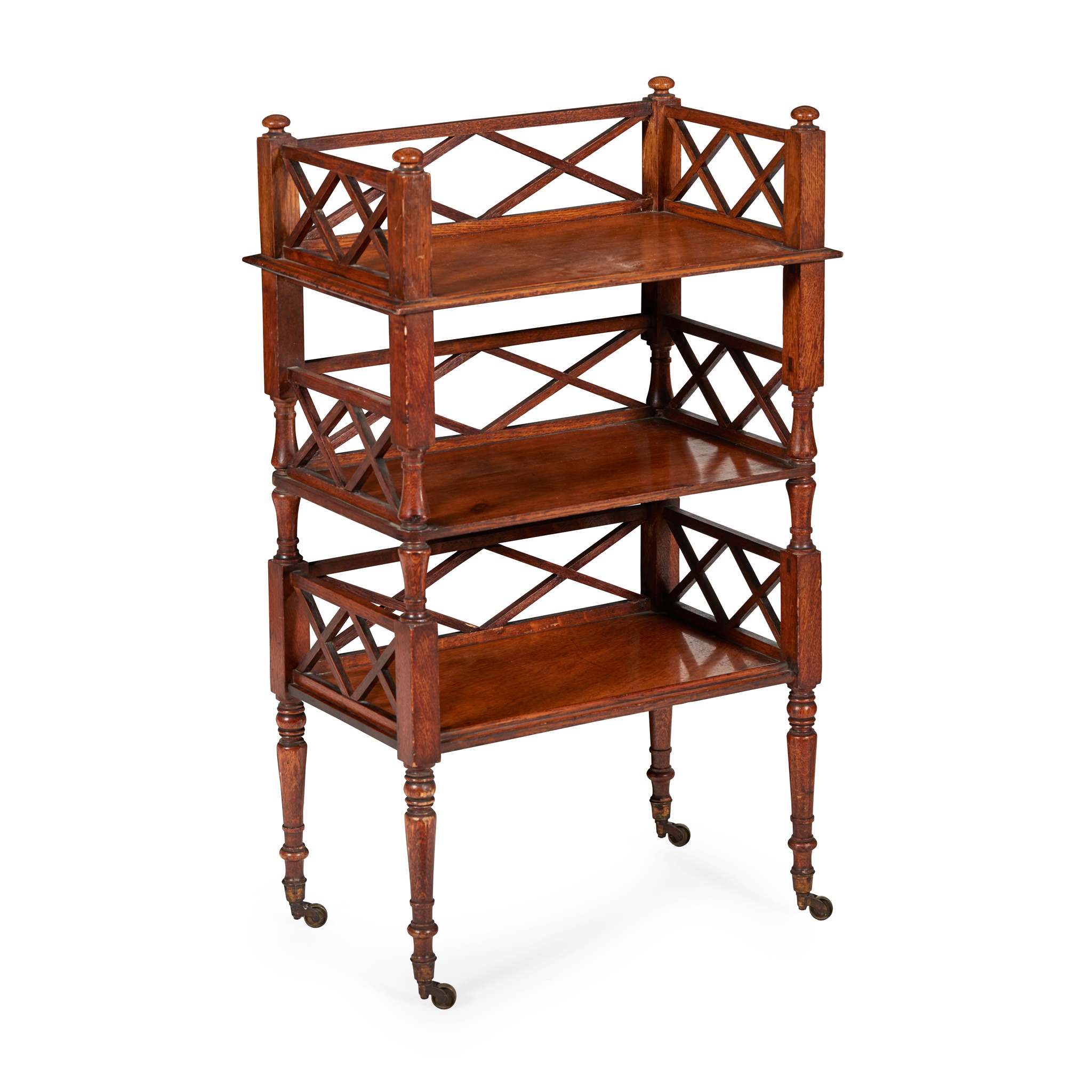 each tier with a three-quarter fretwork gallery, raised on slender turned legs ending in brass caps and castors, bearing a paper inventory label for the Earl of Shelburne