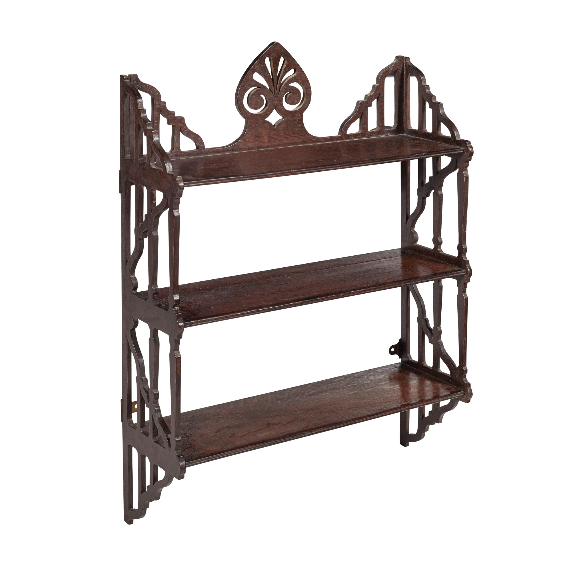 wtih three shelves and fretwork sides and a pierced palmette finial